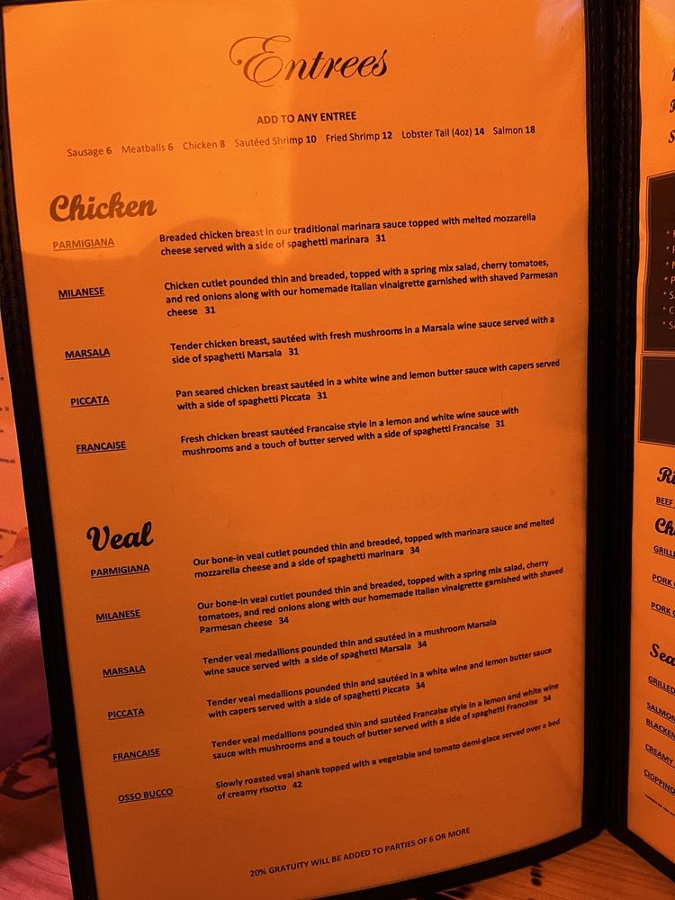 Our bone-in veal cutlet pounded thin and breaded, topped with marinara sauce and melted mozzarella cheese and a side of spaghetti marinara